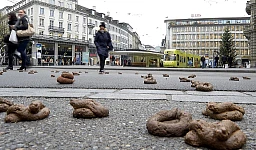 The development organization Helvetas organized an artificial poop squat on World Toilet Day at Zurich's Paradeplatz on Tuesday, November 19, 2013. Billions of people in developing countries have to defecate in public. Feces seep into the groundwater and cause serious health consequences. Over 3,000 children die every day from drinking contaminated water. (KEYSTONE/Walter Bieri)