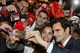 Swiss tennis player Roger Federer (R) poses for a selfie with supporters on November 24, 2014 in Lausanne during the official welcome ceremony after Switzerland won the Davis Cup final.