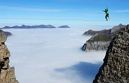 Adrian Zurbrügg (Frutigen) dances on a 30-meter-long highline between the Fisis stocks, high above Kandersteg, far above the abyss and the sea of fog.