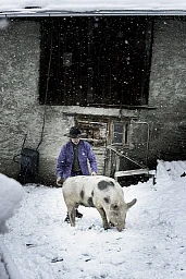 The end of a happy pig: This sow is home slaughtered in the village of Schlans in Grison. The tradition has now almost died out in Switzerland. While it used to be common practice for a journeyman butcher to come to the farm, these days most animals are transported to a slaughterhouse.