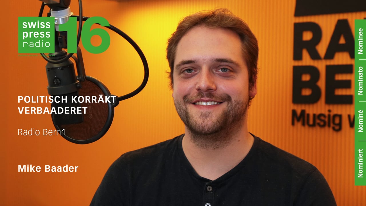 POLITICALLY CORRECTLY VERBAADERET (Swiss Press Audio 2016, by Mike Baader) - Swiss Press AwardBackPOLITICALLY CORRECTLY VERBAADERETRadio BERN12nd placeAudio2016Mike Baader"Politically Correct Verbaaderet" – that was the title of the series of reports broadcast by Radio BERN1 in the run-up to the National Council elections. (There was a separate, independent series for the Council of States elections.)Interview with Mike BaaderSwiss Press Radio 2016 – Mike BaaderInterview with Mike Baader01:28AuthorMike Baader / Swiss Press AwardMike BaaderJournalist, Bern, 1986Learn more