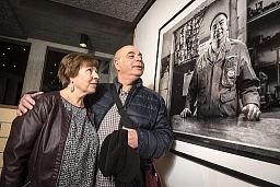 Monthey - April 16, 2016 - Exhibition at the Crochetan Theater: Blackened Hearts, after the closure of the Tamoil factory - The laid-off workers pose with emotion in front of their portrait. Photo: Sabine Pappoud