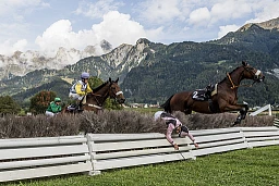 Le jockey suisse Aurélien Rousse tombe de son cheval Famous Boy sur la haie, ce 5 octobre 2014, lors des courses hippiques internationales de Maienfeld / Bad Ragaz. Au bout de cette course de haies de 3800 m, il avait en vue un prix de 15 000 fr.