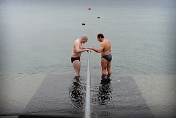 Aveugle de naissance, Muzafer Iseni (à gauche) s’apprête à participer à la course de Noël dans les eaux glaciales du Léman. Son seul repère: la voix de Francis Manent. Après huit semaines d’entraînement, son objectif, dit-il, est de «participer, prendre du plaisir, voir autre chose que d’habitude». Genève, le 15 décembre 2011.