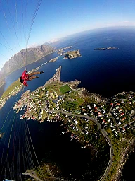 Vue aérienne de la ville de Reine (Lofoten, Norvège). Parapentistes prenant leur envol depuis Reinebringen.