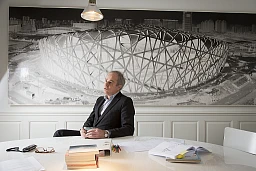 L'architecte Pierre de Meuron dans l'un de ses bureaux devant un tableau de l'artiste chinois Sui Guorui représentant le stade olympique de Pékin, le Nid d'oiseau. Bâle, le 13 février 2013.