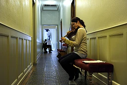 Ginevra, 3 febbraio 2011. Audizione per i musicisti che si candidano a far parte della Verbier Festival Orchestra. Questa giovane violinista aspetta il suo turno mentre prova nel corridoio del conservatorio.